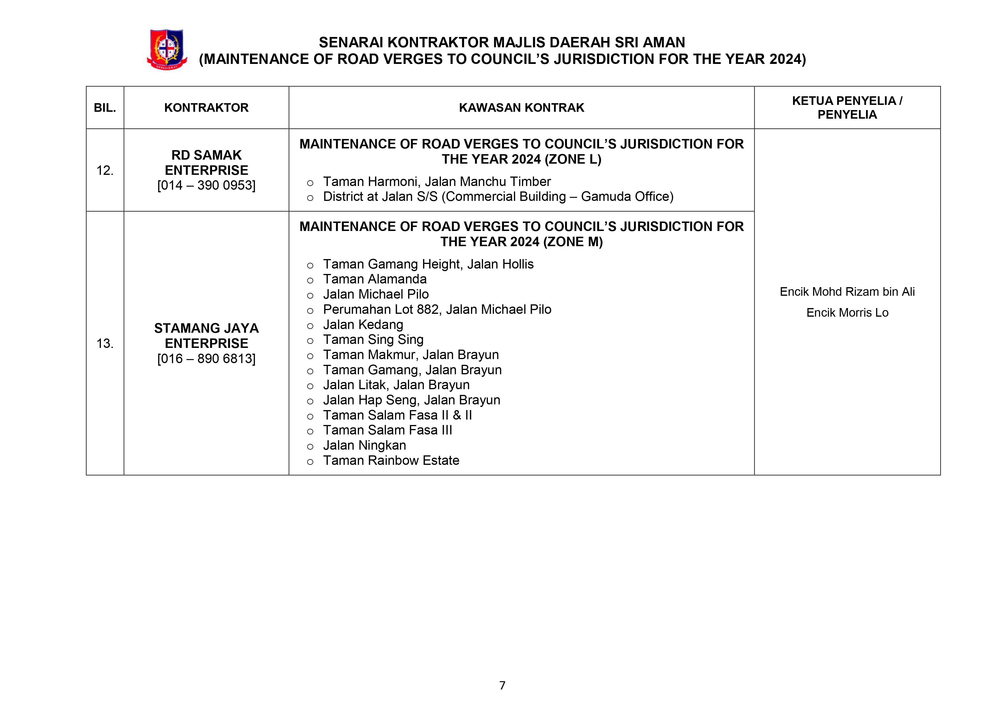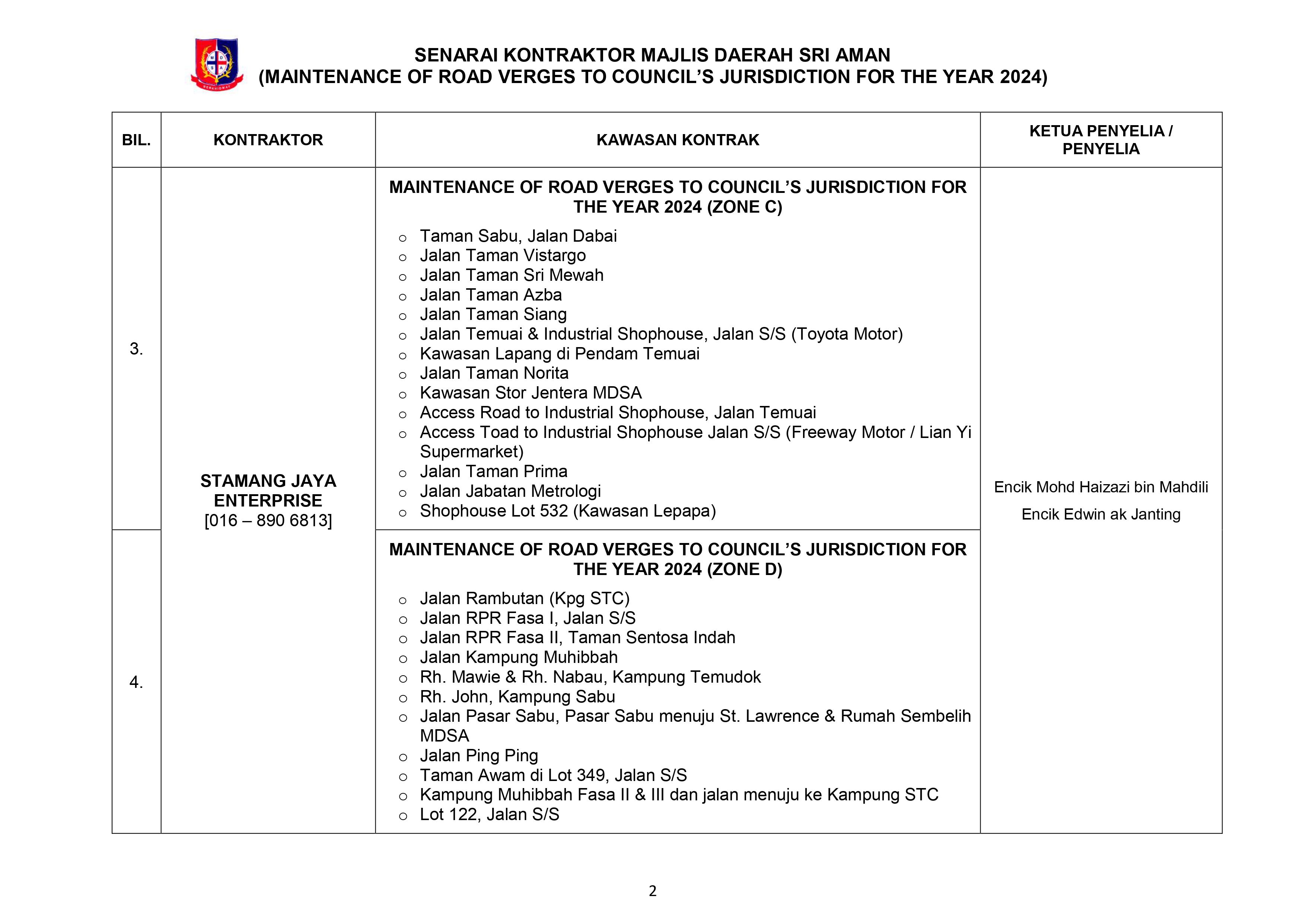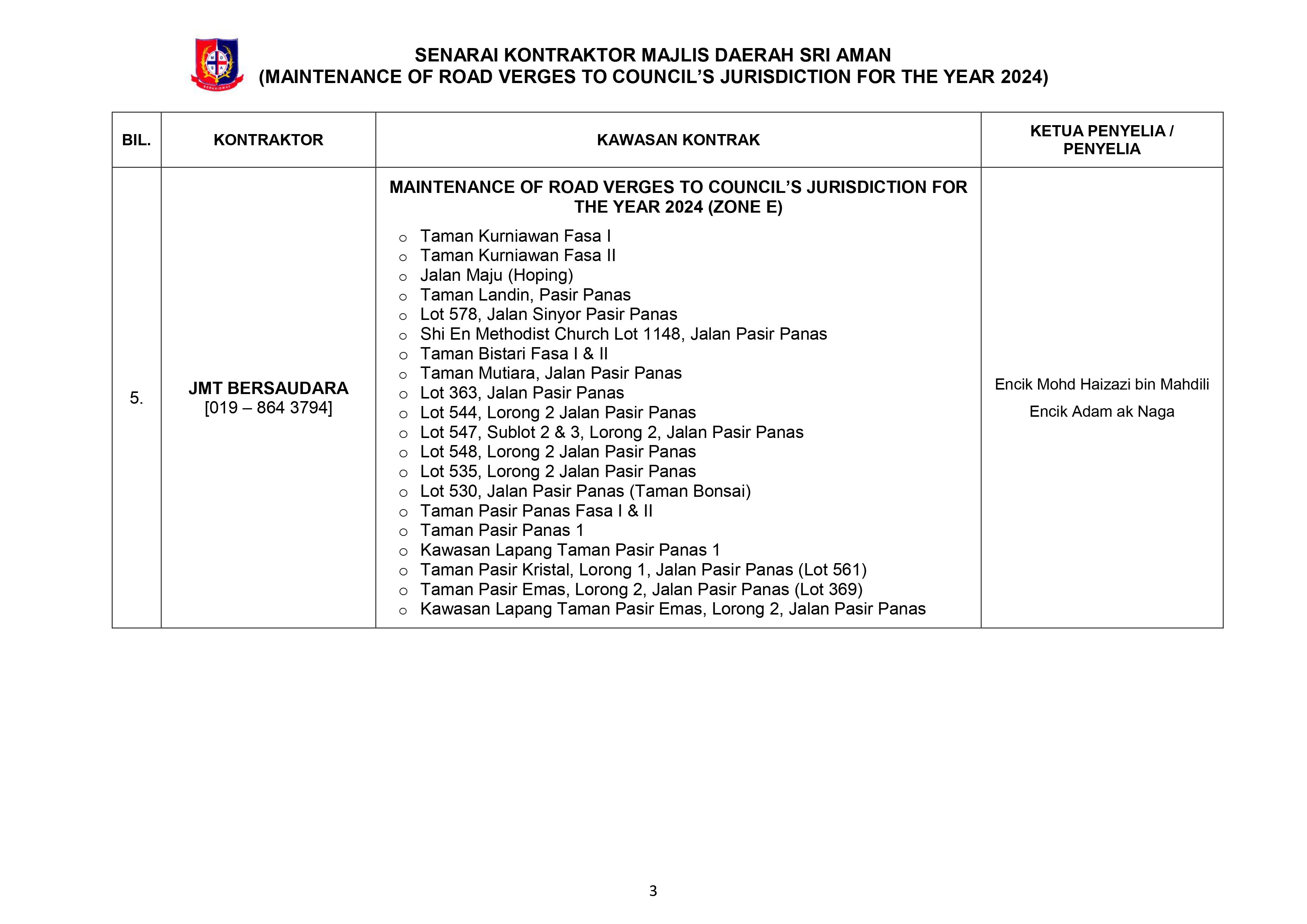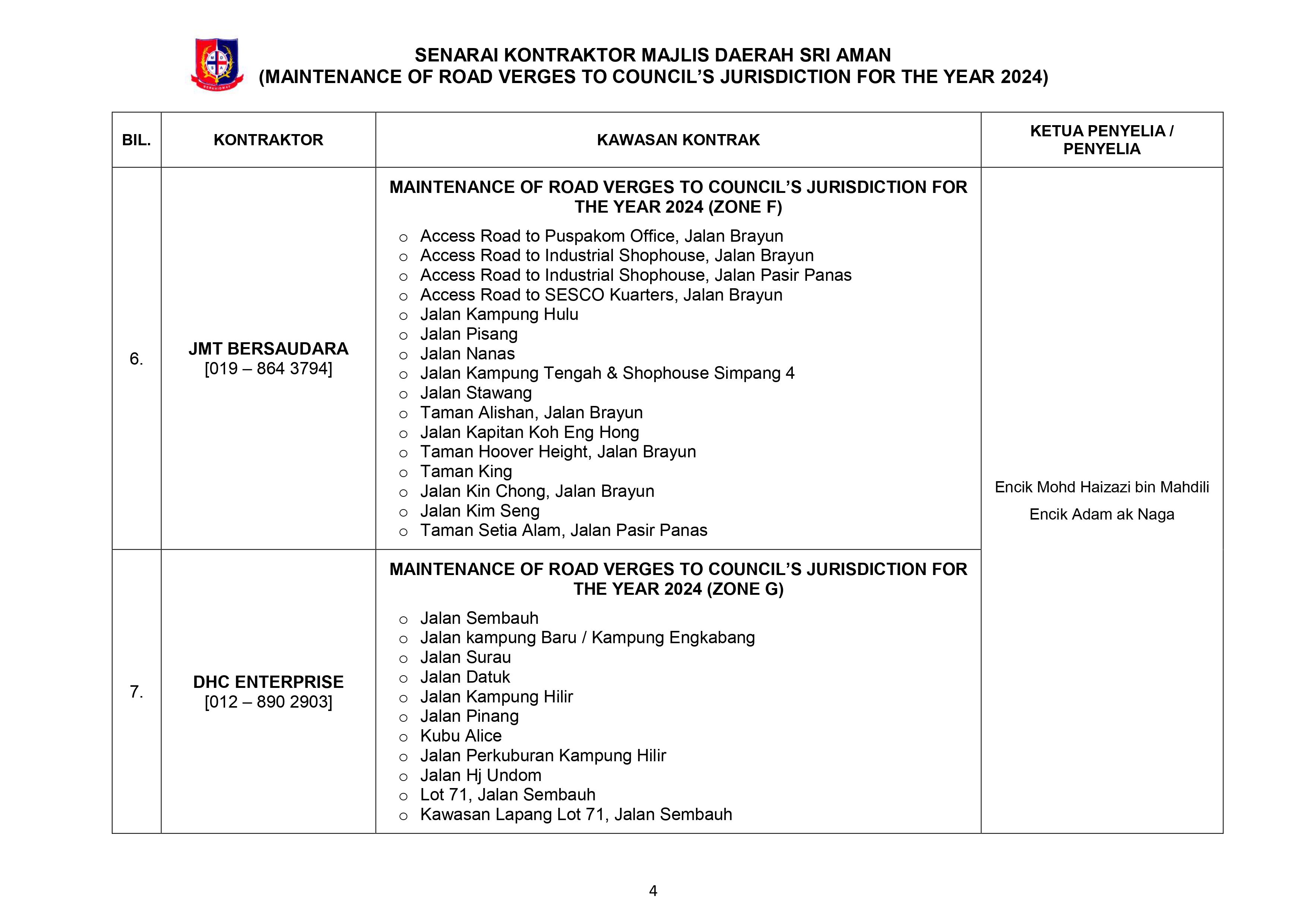 SENARAI KONTRAKTOR MAINTENANCE OF ROAD VERGES TO COUNCIL'S JURISDICTION FOR THE YEAR 2024