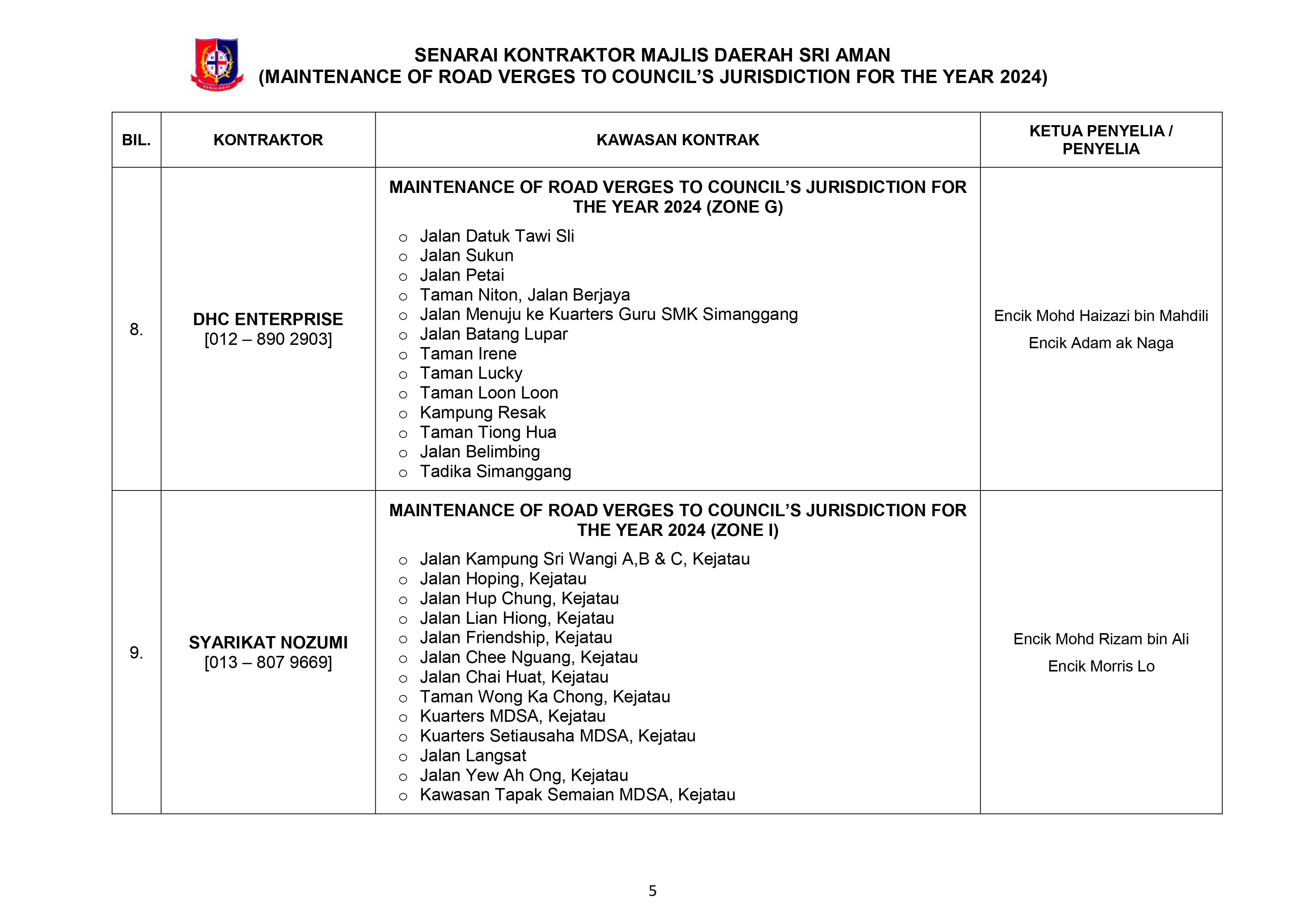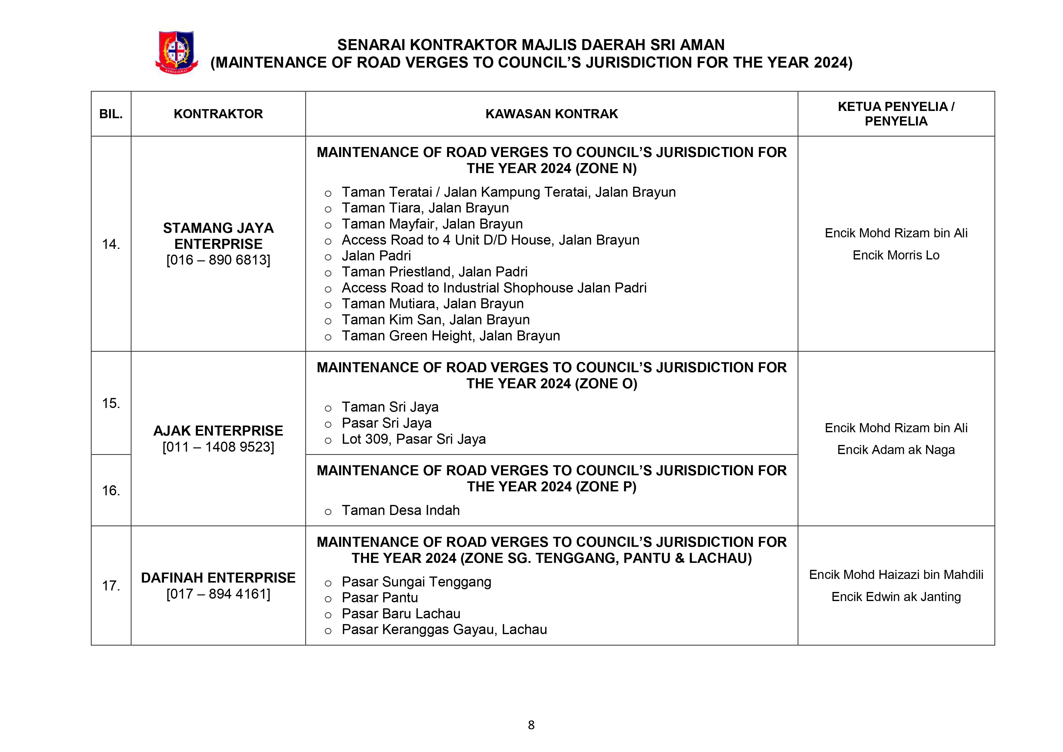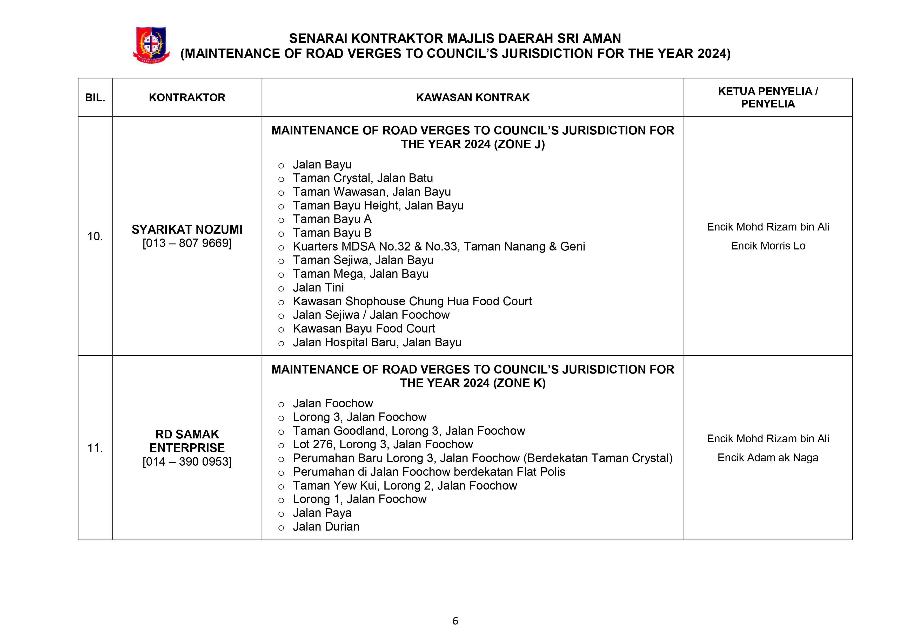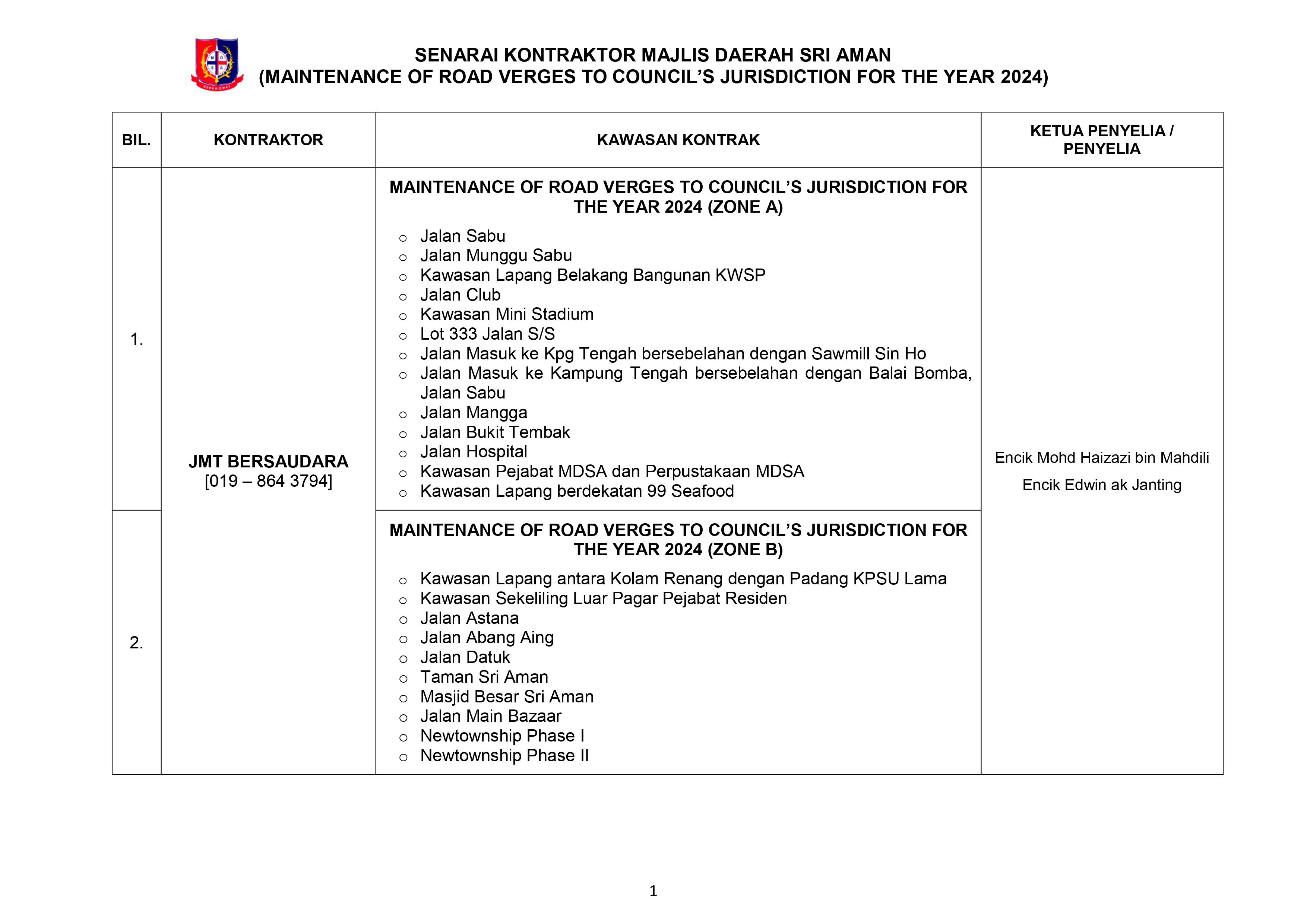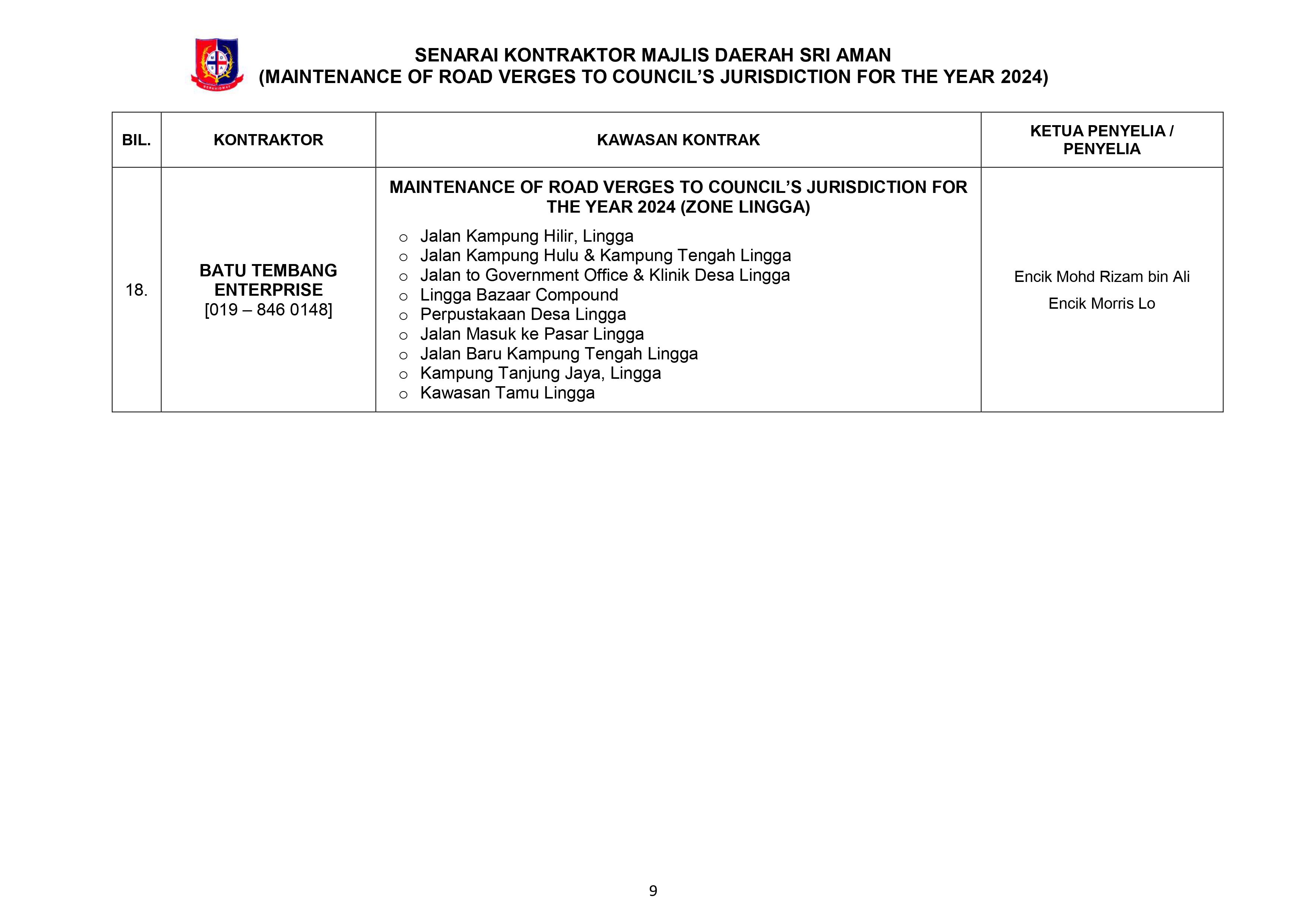 SENARAI KONTRAKTOR MAINTENANCE OF ROAD VERGES TO COUNCIL'S JURISDICTION FOR THE YEAR 2024