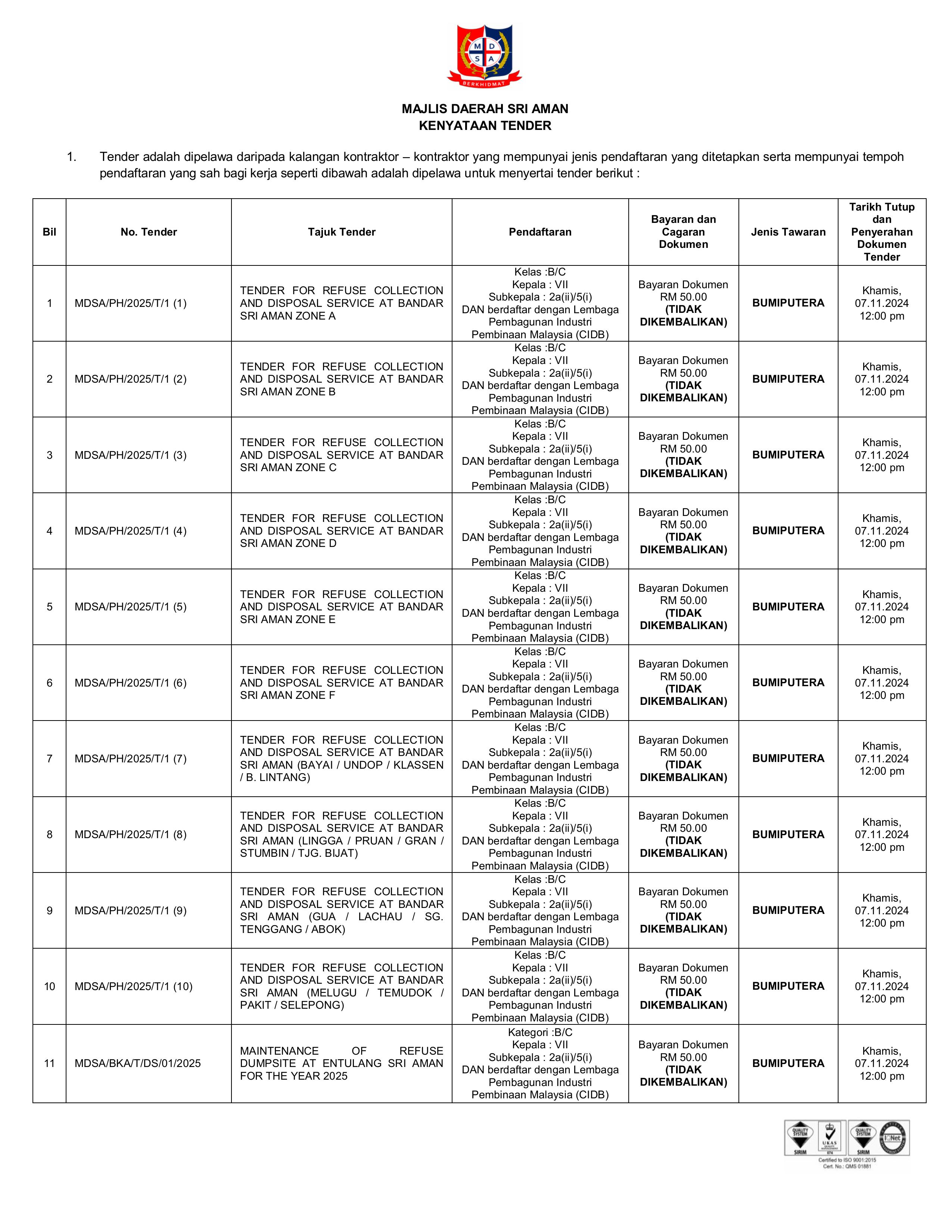 Senarai Kontraktor dan Notis Jadual Kutipan Sisa - Sisa Pepejal Tahun 2025